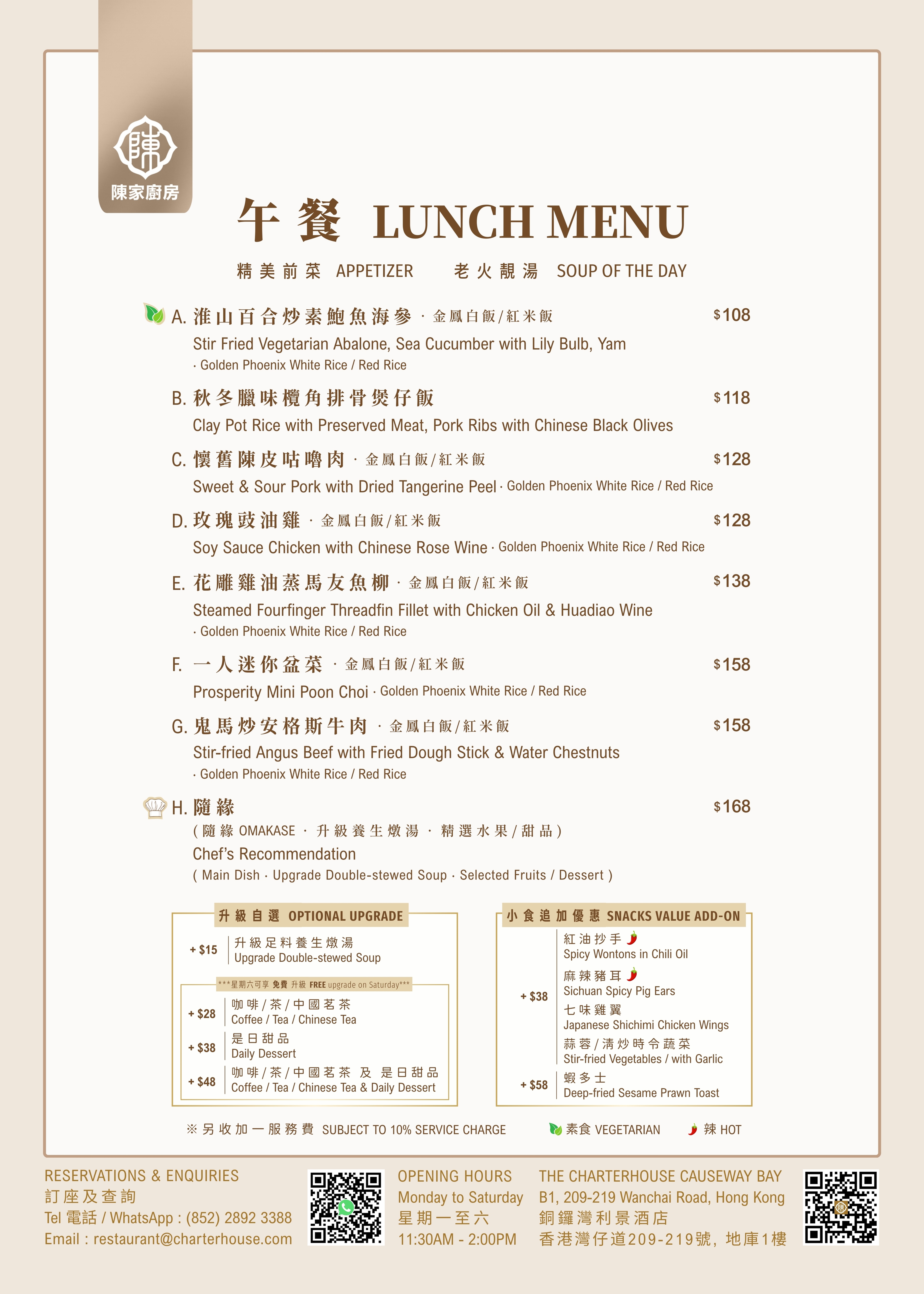Our curated menus feature only fresh and premium ingredients, along with the chef's sophisticated culinary skills in Chinese cuisine. The updated Lunch Menu at Charterhouse Causeway Bay offers a wide array of quality food choices ready for your ultimate indulgence.