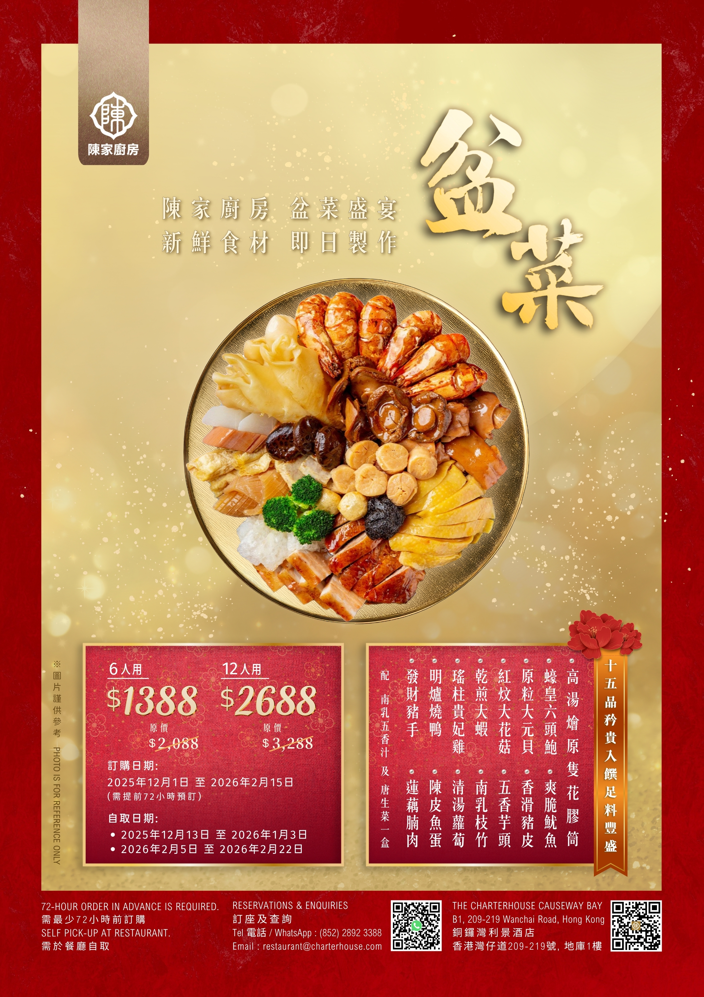 Our Chef is bringing you our authentic Poon Choi featuring luxurious ingredients like abalone, fish maw, dried scallops and Shrimp, totaling more than 10 premium foods. Enjoy your festive meal with our chef-