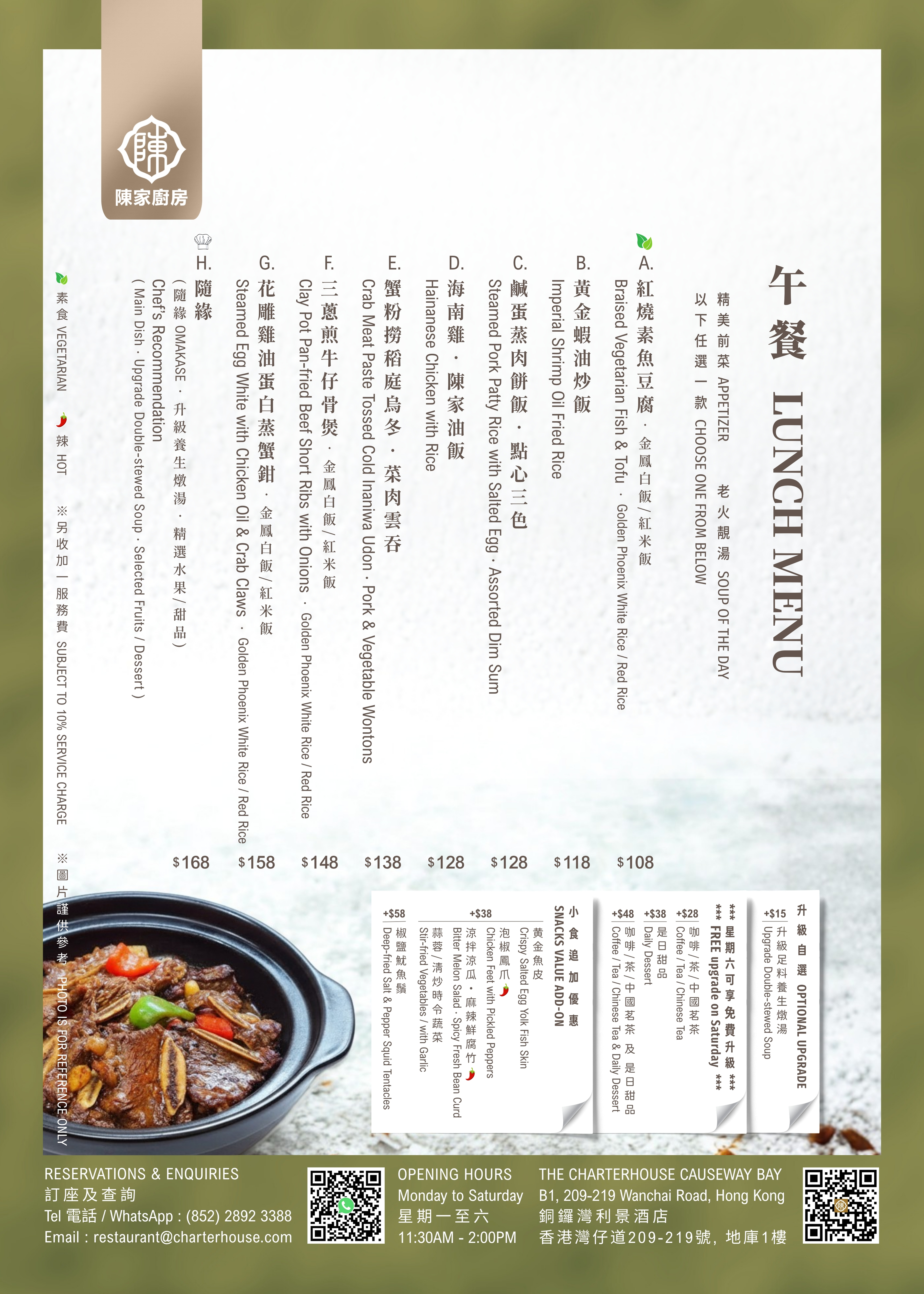 午餐由 HK$108 起,配有 開胃前菜、老火靚湯 及 養生茶。